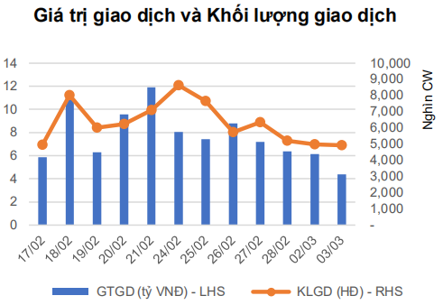 Thanh khoản trên thị trường chứng quyền tiếp tục giảm bấp chất việc thị trường cơ sở đã có một phiên tăng điểm tương đối tích cực trong phiên hôm nay. Trong các mã chứng quyền được giao dịch mạnh, mức độ biến động của các mã này là không thực sự đáng kể và phần lớn đóng cửa tại mức tham chiếu. Chúng tôi hiện vẫn giữ quan điểm thận trọng và cho rằng đây hiện vẫn chưa phải thời điểm thích hợp để NĐT có thể giải ngân mạnh trên thị trường chứng quyền khi rủi ro hiện tại vẫn ở mức cao.