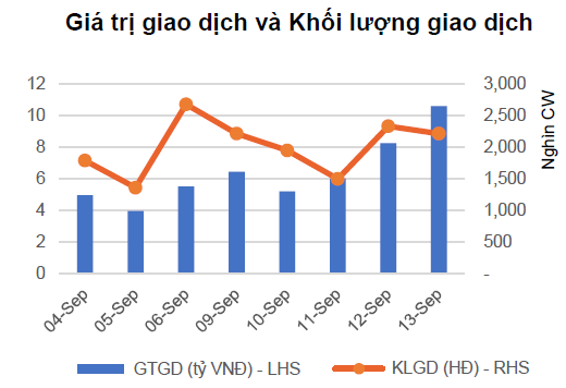 Thị trường chứng quyền hôm nay vẫn có một phiên giao dịch tích cực nhờ diễn biến tốt từ thị trường cơ sở. Thanh khoản cải thiện rất đáng kể khi mà GTGD đạt 10.59 tỉ, tăng 28.24% rất nhiều so với phiên hôm trước. Thanh khoản vẫn tập trung vào các chứng quyền của MWG, FPT và MBB.