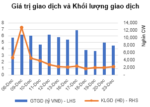 Phiên giao dịch đầu tuần diễn biến khá tiêu cực với 28 mã giảm giá, trong đó đáng chú ý là các mã CHPG1905 (-24,5%), CMSN1902 (-21,8%) có mức giảm mạnh. Bên cạnh, có khá nhiều mã rơi vào tình trạng OTM và đồng thời thanh khoản toàn thị trường vẫn ở mức thấp. Chiều ngược lại, nhiều mã chứng quyền tăng nhẹ nhờ lực kéo từ các cổ phiếu cơ sở MWG, PNJ.