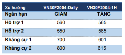 Xu hướng giảm trung hạn vừa qua dự kiến có thể kết thúc tại ngưỡng 560 điêm khi VN30F2004 có thể đã kết thúc sóng 5 theo mẫu hình sóng Elliott. Theo đó, chúng tôi kỳ vọng VN30F2004 đang bước vào nhịp hồi phục lớn.