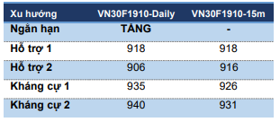 VN30F1910 mở rộng nhịp điều chỉnh về gần ngưỡng 918 điểm. Nhịp giảm vẫn chưa vi phạm xu hướng tăng khi trên đồ thị giá HĐ Tháng 10 vùng 918 có sự hỗ trợ của đường xu hướng kẻ từ ngưỡng 882 điểm Đồng thời, chỉ báo MACD Histogram, Stochastic Oscillator đang cho phân kỳ giá lên ở khung 15 phút.