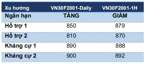 VN30F2001 điều chỉnh mạnh với mức giảm 6.8 điểm khi tiệm cận vùng kháng cự 888-892 điểm cho thấy xu hướng hồi phục vẫn gặp nhiều khó khăn. Tuy vậy, đồ thị giá giữ trên vùng hỗ trợ quan trọng cho xu hướng tương ứng vùng 878-879 điểm nới có cận dưới của đường kênh giá tăng. Đồng thời, đây cũng có sự hội tụ của đường MA(20) phiên ở đồ thị 1H. Vì vậy, dự báo VN30F2001 vẫn còn cơ hội hồi phục từ vùng 878-879 điểm để kiểm định lại vùng 888-892 điểm 1 lần nữa.