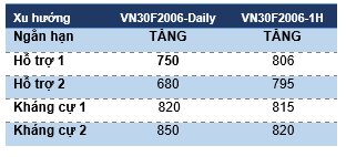 VN30F2006 vẫn đang đi ngang tích luỹ với mẫu hình tam giác nhỏ. Vì vậy, xu hướng tăng ngắn hạn vẫn chưa chấm dứt và khả năng VN30F2006 sẽ còn kiểm chứng vùng kháng cự từ 823-825 điểm trong phiên cuối tuần. Tuy nhiên, khả năng phá vỡ lên trên vùng trên vẫn đang còn bỏ ngõ khi các chỉ báo dao động và xung lực giá đang tạo phân kỳ giảm giá khá rõ.