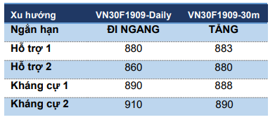 VN30F1909 nhận được hỗ trợ tại ngưỡng 883 điểm giúp đồ thị giá hồi phục và đóng cửa tại mốc 887 điểm. Xu hướng tăng chưa có dấu hiệu chững lại ở khung 15 phút khi các chỉ báo dao động Stochastic trong vùng quá mua trong khi RSI cũng đang hướng lên và chưa tạo phân kỳ giảm giá. Tuy nhiên, RSI đang tiềm ẩn phân kỳ giảm giá nếu xét nhịp tăng 16.08 và 23.08.2019.