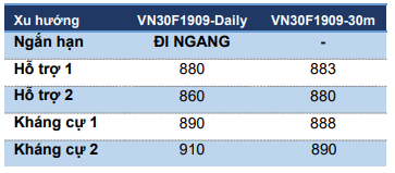 VN30F1909 thoái lùi từ vùng cản 888-889 điểm cho thấy nhịp hồi phục tiếp tục gặp thử thách tại vùng kháng cự mạnh. Đồng thời giá nhiều khả năng đã hoàn thành sóng 5 của nhịp tăng từ ngưỡng 878 điểm. Tín hiệu điều chỉnh sẽ được xác nhận khi giá phá vỡ hoàn toàn ngưỡng 885 điểm.