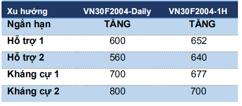 Đồng thời, VN30F2004 có thể đã kết thúc sóng 5 theo mẫu hình sóng Elliott tại ngưỡng 560 điêm. Theo đó, chúng tôi kỳ vọng VN30F2004 đang bước vào nhịp hồi phục lớn và với kháng cự gần từ 680-700 điểm.