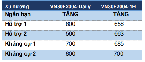 VN30F2004 đang trong nhịp tăng từ ngưỡng 560 điểm với kháng cự gần từ 690-700 điểm.