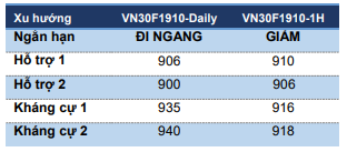 Chiến lược trong phiên (Intraday): Do quán tính giảm nên VN30F1910 có thể giảm xuống ngưỡng hỗ trợ 906 điểm phiên ngày mai. Đồng thời, chúng tôi đánh giá khả năng sẽ xuất hiện nhịp hồi phục mạnh từ vùng giá kể trên là khá cao khi chỉ báo xung lượng đang về lại vùng quá bán.