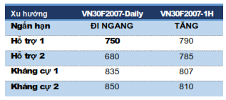 VN30F2007 đã bật tăng từ vùng 791-792 điểm tương ứng cận dưới của đường kênh giá tăng cho thấy xu hướng tăng ngắn hạn vẫn được bảo toàn. Chỉ báo RSI đi lên trở lại từ ngưỡng 50 cắt lên MA(10) của chỉ báo cho thấy xu hướng tăng ngắn hạn đang quay trở lại. Tuy nhiên, nhịp hồi phục từ 750 điểm  đang đi lên theo dạng Zigzag cho thấy đây khả năng vẫn là nhịp hồi phục ngắn hạn. Dự kiến VN30F2007 sẽ hướng lên vùng 807-813 điểm.