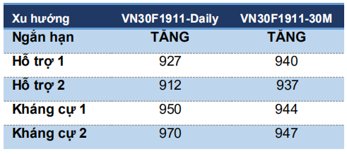 VN30F1911 tiếp tục trụ vững trên vùng 940 điểm và lực Long chiếm thế chủ động về cuối phiên. Đồ thị giá đang tạo break-out sau khi hoàn thành mẫu hình tam giác hướng lên với mục tiêu của mẫu hình này là vùng 944-945 điểm. Đường RSI đang vận động hướng lên tích cực trong khung 30 phút nhưng có thể tạo phân kỳ đôi ngắn hạn nên khả năng sẽ xuất hiện nhịp chỉnh kỹ thuật tại vùng giá kể trên.