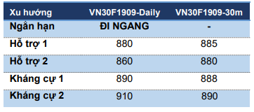 VN30F1909 tiếp tục biến động trong biên độ hẹp trên ngưỡng 885 điểm. Đồ thị giá đang mở ra mẫu hình tiềm năng cái nêm hướng lên Rising Wedge. Mẫu hình dự báo VN30F1909 có thể sẽ còn hướng lên vùng 889-890 điểm một lần nữa.