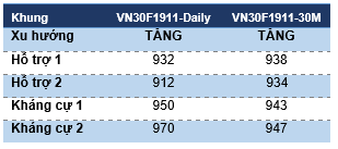 VN30F1911 có phiên điều chỉnh theo thị trường cơ sở. Trong khung 30 phút, chỉ báo RSI đang đi xuống và vẫn chưa có dấu hiệu hồi phục từ chỉ báo này. Vì vậy, dự kiến VN30F1911 có thể sẽ còn điều chỉnh nhẹ về quanh 938 điểm tương ứng cận trên của đường kênh giá tăng ngắn hạn.
