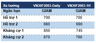 Chiến lược trong phiên (Intraday): Nhà đầu tư xem xét mở Long khi VN30F2003 bật tăng lên khỏi 707.5 điểm, dừng lỗ 702 điểm và mục tiêu 735-745 điểm.