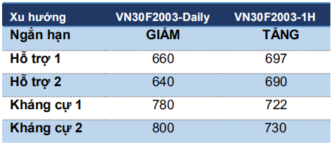 VN30F2003 phản ứng bật tăng tại vùng giá 660 điểm và đóng cửa ở vùng giá cao nhất ngày cho thấy vị thế Long chiếm ưu thế. Chỉ báo RSI đang hướng lên tích cực và chưa có dấu hiệu suy yếu trong khi MACD cho mua trở lại ở khung 30 phút cho thấy đà hồi phục ngắn hạn vẫn chưa chấm dứt. Vùng kháng cự mạnh cho VN30F2003 tương ứng vùng 730-732 điểm tương ứng mức Fibonnacci Retracment 38.2% và đường Trendline kháng cự.