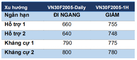 VN30F2005 tiếp tục trạng thái đi ngang trong vùng rộng với biên trên 770-780 điểm và biên dưới 745-750 điểm. Đồng thời, VN30F2005 đang tích luỹ theo mẫu hình tam giác hướng lên và mẫu hình này vẫn đang phát triển. Điều này cho thấy xu hướng chủ đạo vẫn đang là sideway-up.