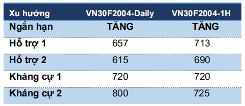 VN30F2004 tiếp tục mở rộng đà tăng và đang áp sát vùng giá 720 điểm. Tuy nhiên, giá  tích luỹ và vùng 713-714 điểm có thể đóng vai trò cho nhịp tăng ngắn hạn. Theo đó, VN30F2004 vẫn còn cơ hội tiến lên vùng 720-725 điểm trong phiên đáo hạn của hợp đồng này.