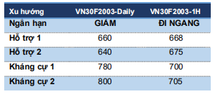 Trong khi đó, xu hướng chủ đạo vẫn giữ ở mức giảm và nhịp đi ngang hiện tại cho thấy VN30F2003 đang tích luỹ trước khi kiểm định vùng hỗ trợ thấp hơn từ 640-650 điểm.