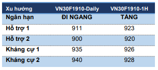 Tuy nhiên, chúng tôi vẫn đánh giá đây là nhịp điều chỉnh kỹ thuật với hỗ trợ từ 922-923.5 điểm tương ứng cận dưới của đường kênh giá giả định và ngưỡng 38.2% Fibo. VN30F1910 được kỳ vọng sẽ biến động trong biên độ 922-928 điểm.