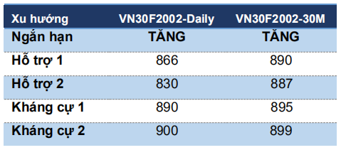 VN30F2002 đang đi lên theo kênh giá tăng ngắn hạn. Tuy nhiên, đồ thị giá vẫn gặp kháng cự ngắn hạn quanh 895 điểm tương ứng cận trên của đường kênh giá và đang có dấu hiệu đi ngang ngắn hạn dưới vùng này. Chỉ báo RSI điều chỉnh từ vùng quá mua trong khi MACD cũng đang cho tín hiệu bán ngắn hạn ở khung 30 phút cho thấy khả năng điều chỉnh tích luỹ ngắn hạn sau nhịp tăng mạnh vừa qua.