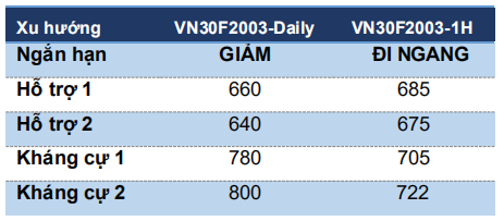 Trong khi đó, xu hướng chủ đạo vẫn giữ ở mức giảm và nhịp đi ngang hiện tại cho thấy VN30F2003 đang tích luỹ ngắn hạn trước khi kiểm định vùng hỗ trợ thấp hơn từ 640-650 điểm.