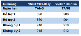 Chiến lược trong phiên (Intraday): Nhà đầu tư có thể áp dụng chiến lược Long trước Short sau. Long VN30F1909 vùng 906-907, mục tiêu 910 điểm và dừng lỗ 904 điểm. Short VN30F1909 (hoặc VN30F1910) khi giá không vượt được vùng 912 điểm với mục tiêu 904 điểm.