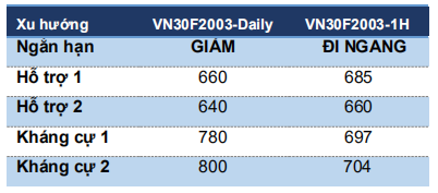 Chiến lược trong phiên (Intraday): Nhà đầu tư xem xét mở Short VN30F2003 (hoặc VN30F2004 do HĐ T3 sắp đáo hạn) tại 693 điểm, mục tiêu 650-660 điểm và dừng lỗ trên 697 điểm cho VN30F2003. Nhà đầu tư lưu ý phiên ngày mai là phiên đáo hạn của HĐ T3 nên hạn chế giao dịch hợp đồng này trong phiên ATC.