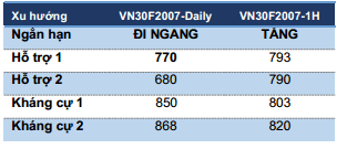VN30F2007 đi ngang tích luỹ trong vùng 777-792 điểm theo mẫu hình dạng Flat. Mẫu hình này cho thấy đây xu hướng hồi phục từ 760 điểm vẫn còn. Đồng thời, giá đang nâng đáy cao và đồ thị giá đang có xu hướng đi theo kênh giá tăng.