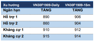 Chiến lược trong phiên (Intraday): Nhà đầu tư cân nhắc mở vị thế Short VN30F1910 (do VN30F1909 sắp đáo hạn) khi đồ thị giá VN30F1910 tiệm cận ngưỡng 912 điểm với mục tiêu 905 điểm, dừng lỗ 914 điểm.