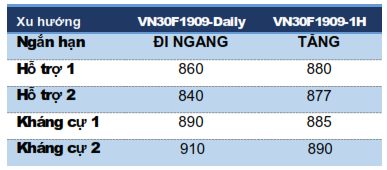 VN30F1909 đi ngang nhưng giá đang được hỗ trợ tại ngưỡng 880 điểm. Đồng thời vị thế Long lấn áp về cuối phiên tiếp tục củng cố giá bên trên vùng hỗ trợ quan trọng 878-880 điểm. Ngoài ra, đếm sóng Elliott, nhịp giảm hiện tại là sóng 4 điều chỉnh vả khả năng sẽ sớm kết thúc.
