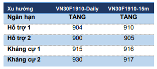 VN30F1910 tiếp tục xu hướng tăng khi nâng đáy cao hơn. Xu hướng tăng có thể tiếp tục giúp đưa VN30F1910 tiến lên vùng 916-917 điểm tương ứng đường kênh giá tăng ngắn hạn.