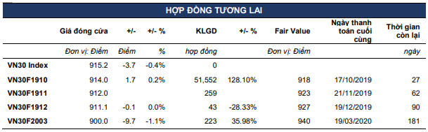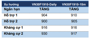 VN30F1910 điều chỉnh kỹ thuật khi giảm điểm nhưng vẫn duy trì trong kênh giá tăng ngắn hạn. Đồng thời, giá bật tăng mạnh về cuối phiên cho thấy bên Long tiếp tục chủ động ở vùng giá thấp. Vì vậy, chúng tôi cho rằng VN30F1910 sẽ tiếp tục hướng lên vùng 916-917 điểm vào ở phiên đầu tuần.