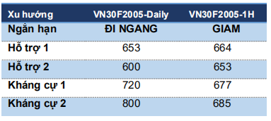 Xu hướng chủ đạo vẫn ở trạng thái đi ngang với vùng hỗ trợ 653-664 điểm và kháng cự bên trên 720-730 điểm cho VN30F2005.