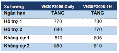Chiến lược trong phiên (Intraday):  Nhà đầu tư mở Long khi VN30F2006 còn trong vùng 783.5-785 điểm, dừng lỗ 780 điểm và mực tiêu 805-810 điểm.