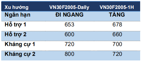 Xu hướng chủ đạo vẫn ở trạng thái đi ngang với vùng hỗ trợ 660-664 điểm và kháng cự bên trên 720-730 điểm cho VN30F2005.