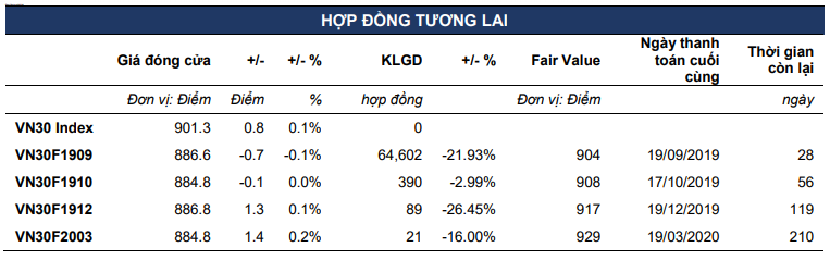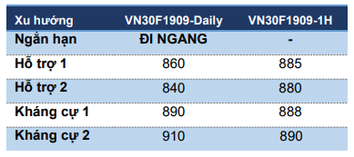VN30F1909 có phiên kiểm chứng vùng kháng cự 889-890 điểm bất thành. Đồng thời đường giá đã đi xuống khỏi đường xu hướng ngắn hạn kể từ đáy 861 điểm. Chỉ báo RSI, MACD hình thành phân kỳ giá xuống cho thấy xung lực tăng yếu đi và thường cảnh báo đảo chiều xu hướng.