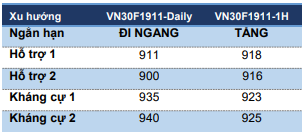 Nhìn rộng ra, VN301911 đang dao động sideway khả năng mẫu hình tam giác tăng giá. Vì vậy, giá vẫn khả năng sẽ đi ngang trong vùng kháng cự 925-929 và hỗ trợ 916-918 điểm.