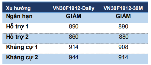 VN30F1912 trải qua phiên giảm thứ 3 liên tiếp với cây nến đỏ dài ở khung Daily. Chỉ báo ATR cũng đi lên ở khung Daily cho thấy mức biến động đang khá mạnh. Vùng hỗ trợ gần quanh 888-890 điểm xác định theo mục tiêu của mẫu hình RunAway Gap hình thành phiên cuối tuần.