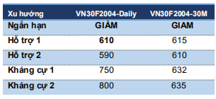 Đồ thị VN30F2004 đã phá vỡ vùng đáy ngắn hạn 656 điểm và tiếp tục một phiên giảm hết biên độ. Theo đó, VN30F2004 có thể còn quán tính giảm với vùng hỗ trợ 600-610 điêm tương ứng mức Fibonacci Projection 38.2-50% vào đầu phiên ngày mai.