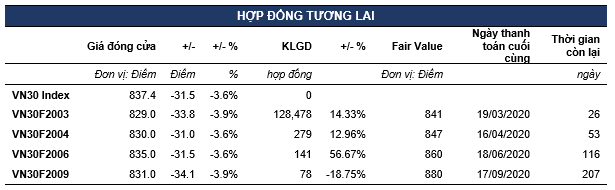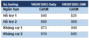 VN30F2003 mở rộng nhịp điều chỉnh về vùng 829 điểm, với mức chênh lệch basis -8.4 điểm so với chỉ số cơ sở. Mặc dù vậy, xu hướng ngắn hạn vẫn đang được giữ ở trạng thái đi ngang với mẫu hình tam giác. Theo đó, VN30F2003 kỳ vọng sẽ hồi phục từ vùng 825-829 điểm về lại vùng kháng cự 845-848 điểm.  Chỉ báo RSI đã về vùng quá bán ở khung 30 phút trong khi MACD Histogram cũng đã hình thành phân kỳ tăng giá ở trong khung này.