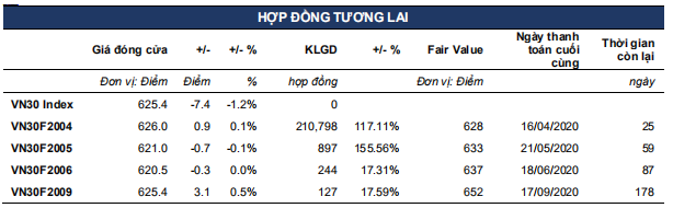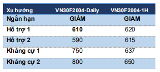 Đồ thị VN30F2004 đang đi theo kênh giá giảm nhưng đường giá đã có sự chững lại tại cận dưới tương ứng vùng 618-620 điểm. Đồng thời, kỳ vọng giá cũng đã kết thúc sóng 5 của nhịp giảm từ 702 điểm tại ngưỡng 620 điểm. Đồ thị giá break lên trên 637 điểm trong phiên tới sẽ xác nhận đáy ngắn hạn được thiết lập