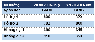 VN30F2003 bật tăng từ mức thấp nhất phiên 920 điểm củng cố mẫu hình tam giác hướng xuống tiếp tục có hiệu lực. Theo đó, nhịp hồi phục có thể tiếp diễn về vùng kháng cự gần 845-850 điểm tương ứng vùng Fibonacci Retracement 50% và 61.8%. Chỉ báo RSI đang hồi phục tích cực ở khung 30 phút trong khi Stochastic Oscilator cũng đang hướng lên.