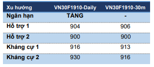 Chiến lược trong phiên (Intraday): Nhà đầu tư mở vị thế Long VN30F1910 tại 909.5 điểm và dừng lỗ tại 907.1 điểm với mục tiêu 913-915 điểm.