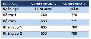 VN30F2007 vẫn đang đi xuống theo đường kênh giá giảm cho thấy xu hướng giảm vẫn đang chi phối với nhịp giảm tăng đan xen nhau. Tuy nhiên, các chỉ báo kỹ thuật như MACD Histogram, RSI đang có sự lưỡng lự cũng như tiềm ẩn phân kỳ tăng cho thấy xung lực giảm đang dần suy yếu. Dự báo, VN30F2007 sẽ còn rung lắc điều chỉnh trong phiên đầu tuần với vùng 771-774 điểm tương ứng vùng 50-61.8% Fibonacci Retracement kỳ vọng sẽ đóng vai trò hỗ trợ.