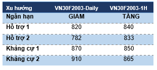 VN30F2003 tiếp tục hồi phục từ vùng đáy 820 điểm và đi lên theo kênh giá tăng ngắn hạn với cận trên của đường kênh tương ứng 849-850 điểm. Mặc dù vậy, chỉ báo RSI đang hướng lên tích cực ở khung 1H trong khi MACD cũng nới rộng khoản cách với đường tín hiệu cho thấy xung lực tăng tích cực và đà tăng ngắn hạn có thể duy trì với các nhịp tăng giảm đang xen. Theo đó, VN30F2003 có thể tiếp diễn nhịp hồi phục về vùng kháng cự gần 850-855 điểm.