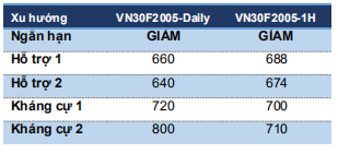 VN30F2005 hồi phục theo dạng Zigzag theo đường kênh giá hồi phục ngắn hạn. Đồng thời, đồ thị giá đang tạo đỉnh sau thấp hơn đỉnh trước khi giảm mạnh từ vùng 710 điểm cho thấy khả năng nhịp hồi phục ngắn hạn có thể chấm dứt tại 710 điểm. Xu hướng giảm sẽ được xác nhận khi giá phá vỡ hoàn toàn vùng 688-690 điểm tương ứng cận dưới của đường kênh giá trong phiên tới.