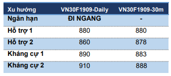 VN30F1909 nhanh chóng điều chỉnh trở lại khi gặp vùng 887-888 điểm. Đồng thời đường giá đóng cửa bên dưới vùng ranh giới quanh 882 điểm tương ứng cận dưới của mẫu hình tam giác tăng. Tín hiệu này cho thấy mẫu hình kể trên không còn hiệu lực. Rủi ro điều chỉnh đang ở mức cao khi giá không vượt lên trên vùng 881-882 điểm.