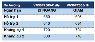 VN30F2005 tiếp tục xu hướng đi ngang theo dạng mẫu hình tam giác thu hep với vùng hỗ trợ 690-692 điểm trong khi kháng cự tương ứng vùng 703-704 điểm. Vì đây là mẫu hình tiếp diễn xu hướng (continuation pattern) và vẫn chưa hoàn thành nên dự báo VN30F2005 sẽ tiếp tục trang thái đi ngang trong biên độ kể trên trong phiên tới.