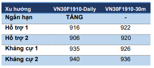Chiến lược trong phiên (Intraday): Nhà đầu tư mở vị thế Long VN30F1910 quanh 921-922 điểm với mục tiêu 926 điểm và dừng lỗ khi giá thủng 920 điểm.