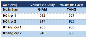 VN30F1911 đang hình thành dao động đi lên theo đường kênh giá ngắn hạn. Giá hiện vẫn gặp kháng cự tạm thời tại ngưỡng 930 điểm khi đóng cửa thoái lùi về dưới ngưỡng này. Đồng thời, chỉ báo Bollinger Band With ở khung 30 phút vẫn ở dưới ngưỡng 0.008 cho thấy khả năng VN30F1911 sẽ cần tích lũy thêm trong vùng 927-930 điểm.
