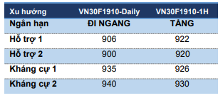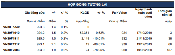 VN30F1910 biến động trong biên độ tương đối hẹp nhưng vẫn được hỗ trợ 921-922 điểm. Đồ thị giá của hợp đồng tháng 10 vẫn duy trì xu hướng tăng ngắn hạn với kháng cự gần từ 925-927 điểm.